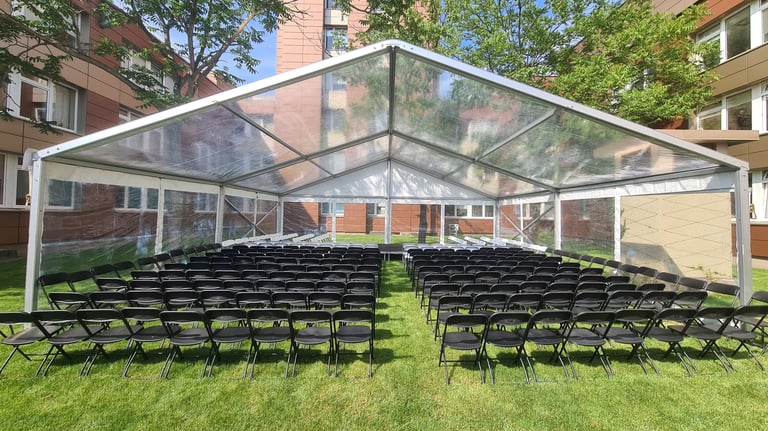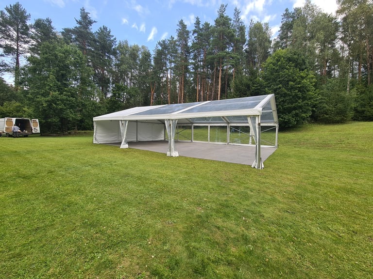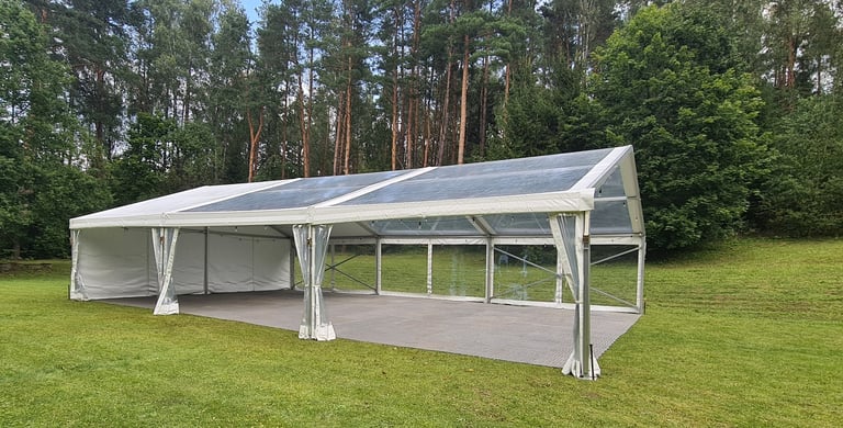 Modulinis paviljonas su skaidriu arba baltu stogu yra puikus sprendimas įvairaus tipo renginiams, šventėms ir parodoms. Konstrukcija leidžia paviljoną pritaikyti pagal renginio dydį – nuo mažų, jaukių vestuvių iki didesnių verslo renginių ar konferencijų. Aukštos lubos, vidinių kolonų nebuvimas ir lengvai atidaromos šoninės sienos užtikrina erdvumo pojūtį bei suteikia plačias dekoravimo galimybes.